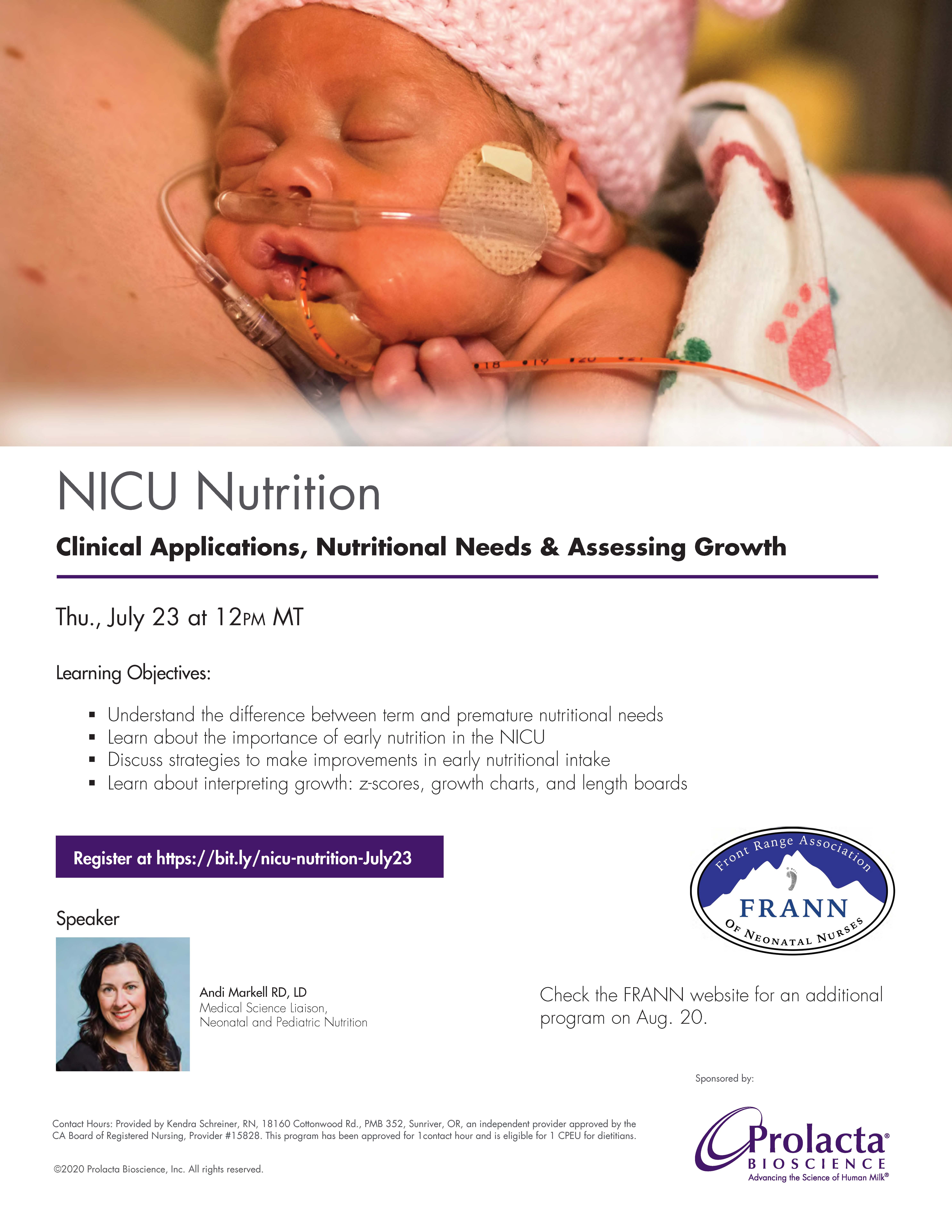 Join us for a one hour webinar presented by Andi Markell RD, LD, Medical Science Liason for Neonatal and Pediatric to explore NICU Nutrition!